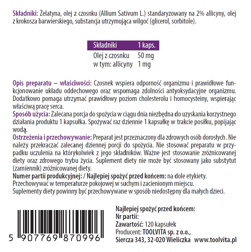 Składnik aktywny (w 1 kapsułce) Olej z czosnku (50 mg)