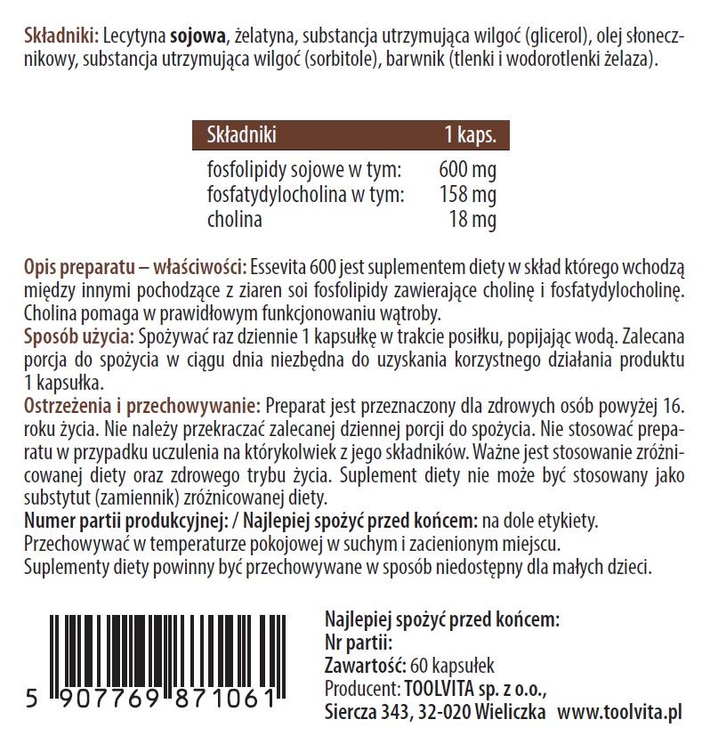 Suplement diety „ESSEVITA 600” zawiera między innymi pochodzące z ziaren soi fosfolipidy zawierające cholinę i fosfatydylocholinę.