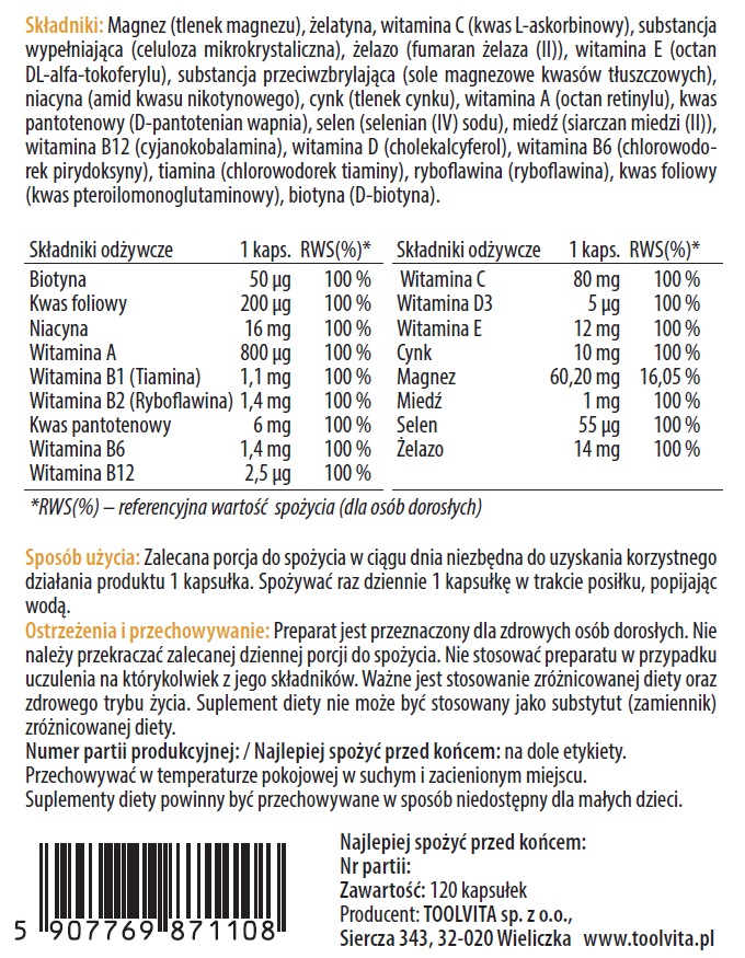 Pełny skład: Magnez (tlenek magnezu), żelatyna, witamina C (kwas L-askorbinowy), substancja wypełniająca (celuloza mikrokrystaliczna), żelazo (fumaran żelaza (II)), witamina E (octan DL-alfa-tokoferylu), substancja przeciwzbrylająca (sole magnezowe kwasów tłuszczowych), niacyna, cynk, witamina A, kwas pantotenowy, selen, miedź, witamina B12, witamina D, witamina B6, tiamina, ryboflawina, kwas foliowy, biotyna.