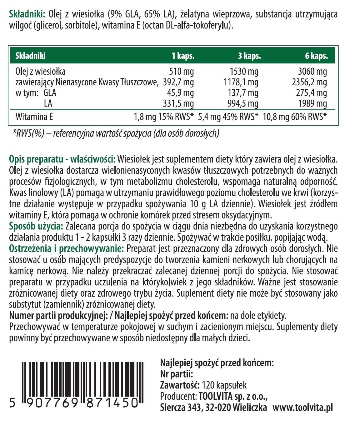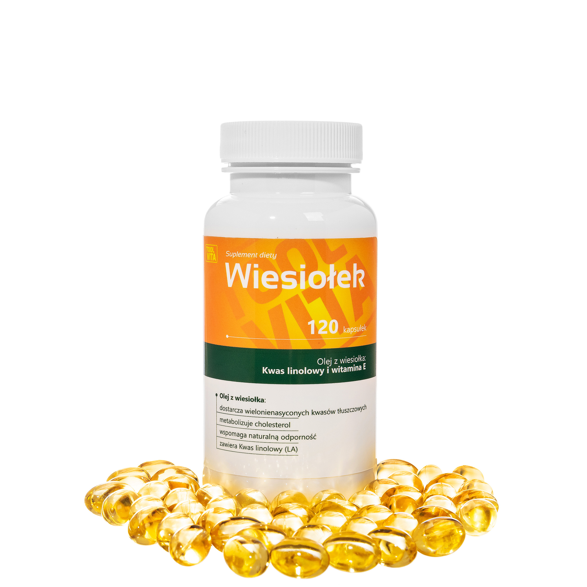 „Wiesiołek” jest suplementem diety, który zawiera olej z wiesiołka i jest źródłem witaminy E, która pomaga w ochronie przed stresem oksydacyjnym.