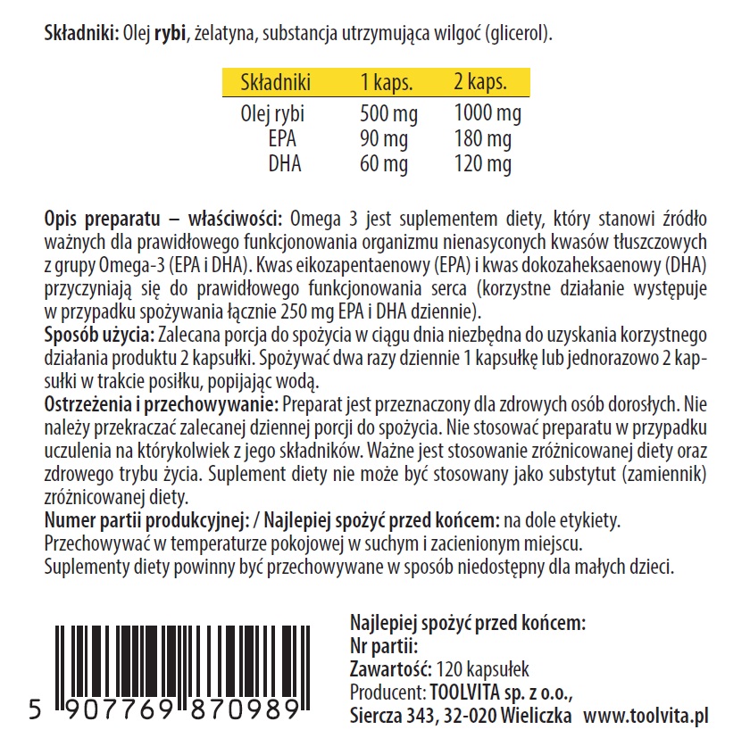 | Składnik aktywny (w 1 kapsułce) | Olej rybi (500 mg) |