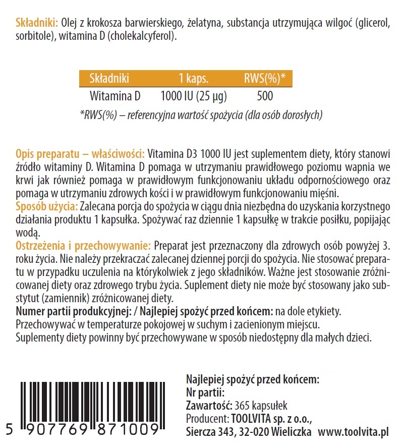 | Zawartość w 1 kapsułce | 25 µg (1000 IU) / 500% RWS* |