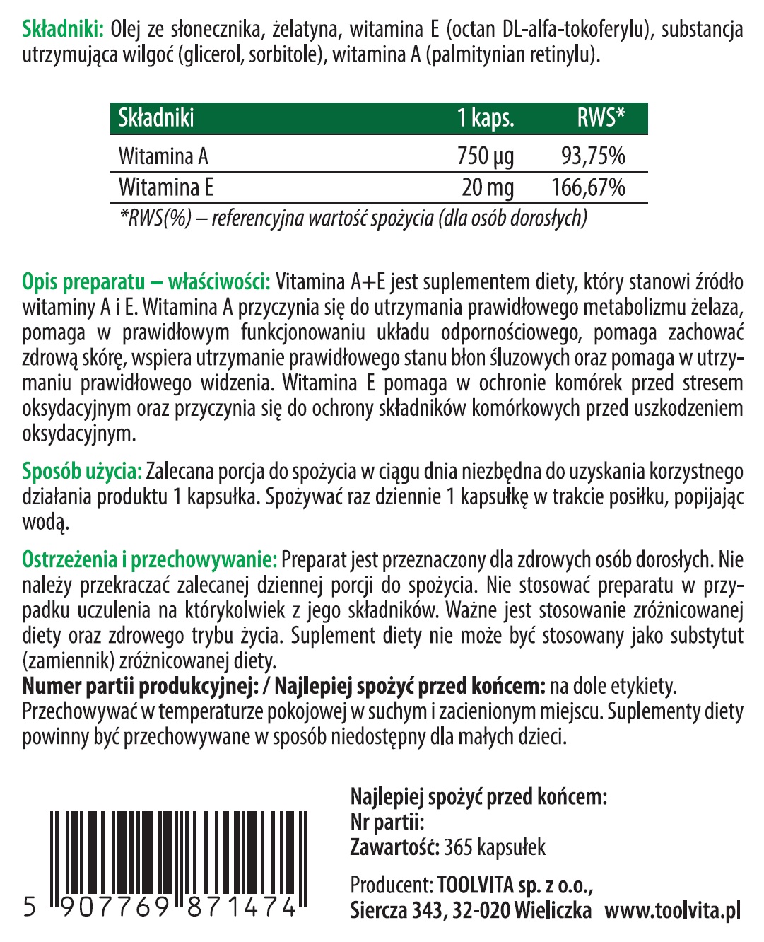 Suplement diety „VITAMINA A+E” stanowi źródło witaminy A i E.
