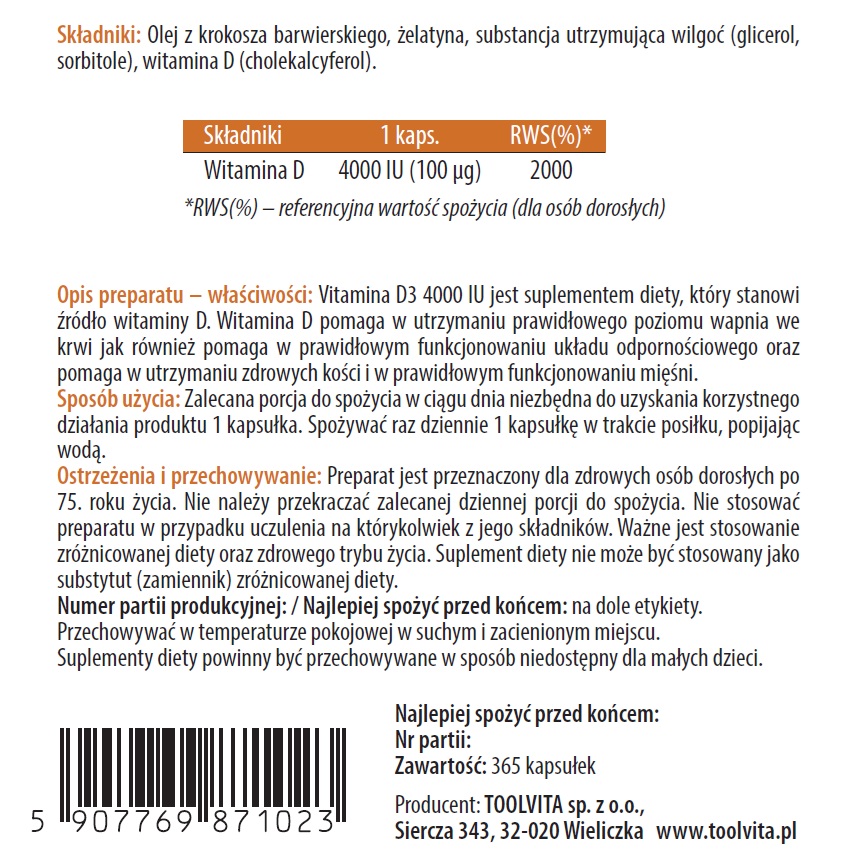 Suplement diety „VITAMINA D3 4000 IU” stanowi źródło witaminy D.